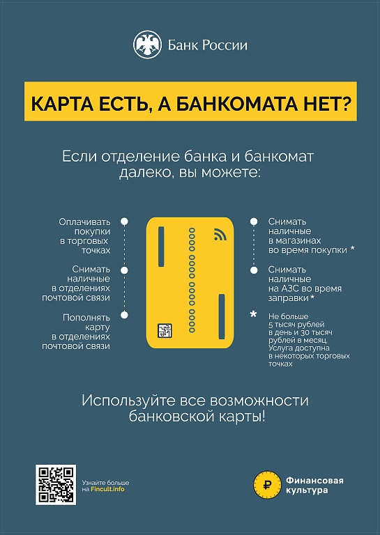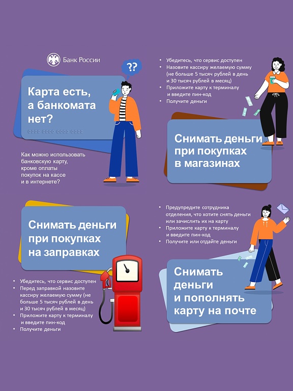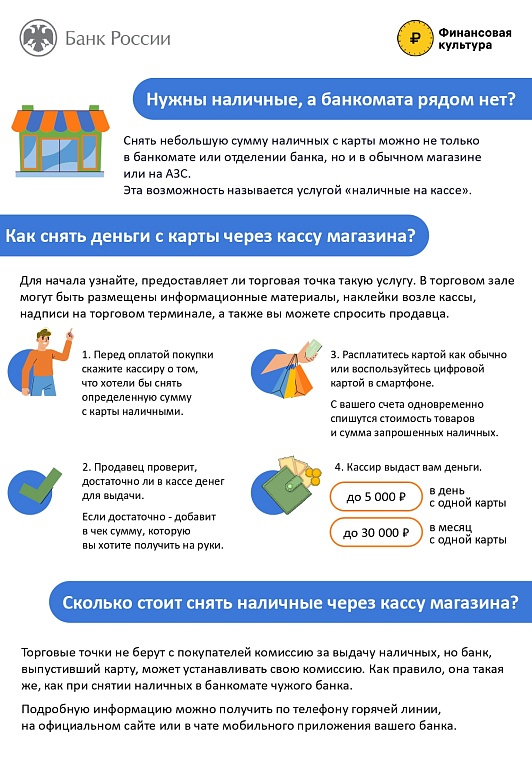 Для граждан теперь доступна услуга «наличные на кассе» — снять деньги можно прямо в магазине, на АЗС или почте при совершении покупки. Лимит — до 5 000 ₽ в день и 30 000 ₽ в месяц. Комиссия зависит от банка, выпустившего карту.