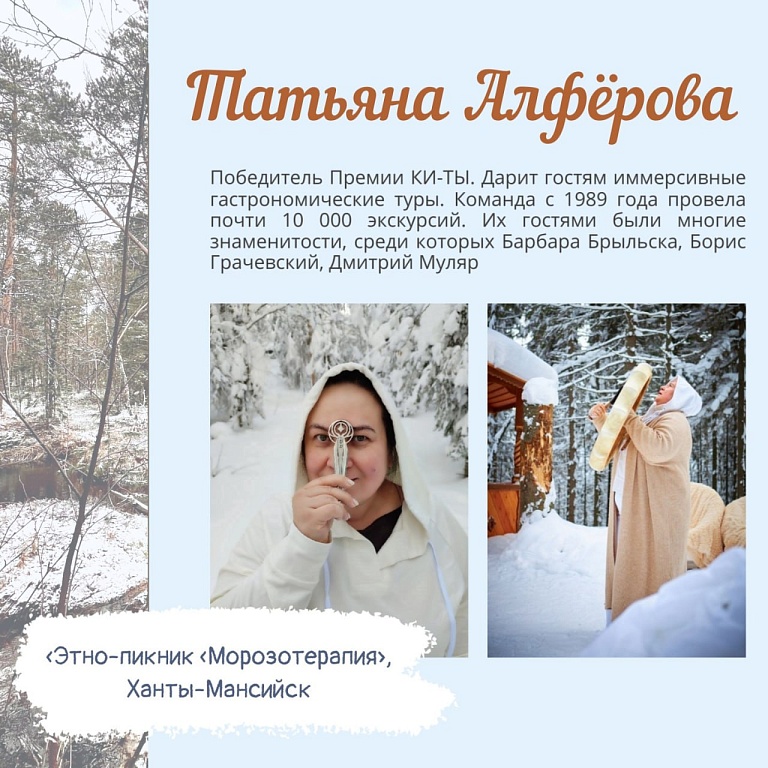 — Татьяна Алфёрова, «Этно-пикник «Морозотерапия», Ханты-Мансийск. Победитель Премии КИ-ТЫ. Дарит гостям иммерсивные гастрономические туры. Команда с 1989 года провела почти 10 000 экскурсий. Их гостями были многие знаменитости, среди которых Барбара Брыльска, Борис Грачевский, Дмитрий Муляр.