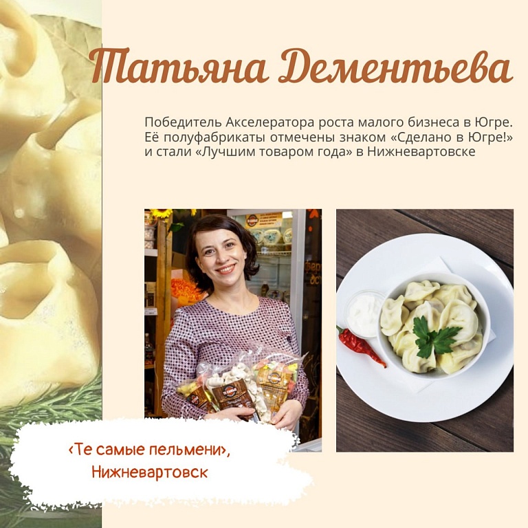 — Татьяна Дементьева, «Те самые пельмени», Нижневартовск. Победитель Акселератора роста малого бизнеса в Югре. Её полуфабрикаты отмечены знаком «Сделано в Югре!» и стали «Лучшим товаром года» в Нижневартовске.