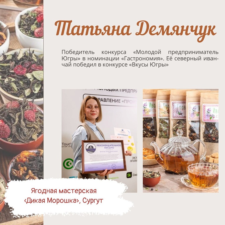 — Татьяна Демянчук, ягодная мастерская «Дикая Морошка», Сургут. Победитель конкурса «Молодой предприниматель Югры» в номинации «Гастрономия». Её северный иван-чай победил в конкурсе «Вкусы Югры».