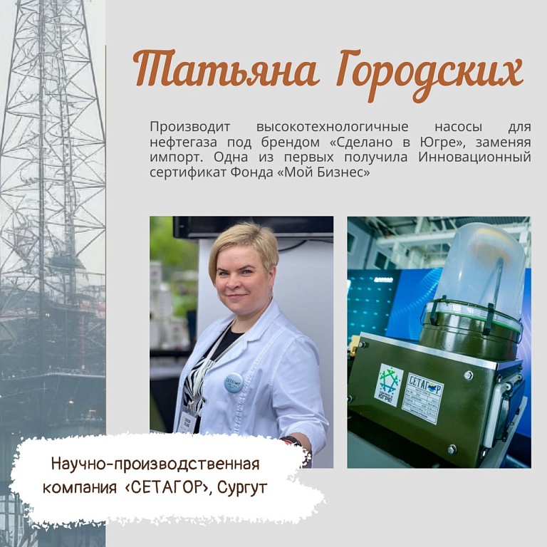 — Татьяна Городских, научно-производственная компания «СЕТАГОР», Сургут. Производит высокотехнологичные насосы для нефтегаза под брендом «Сделано в Югре», заменяя импорт. Одна из первых получила Инновационный сертификат Фонда «Мой Бизнес».