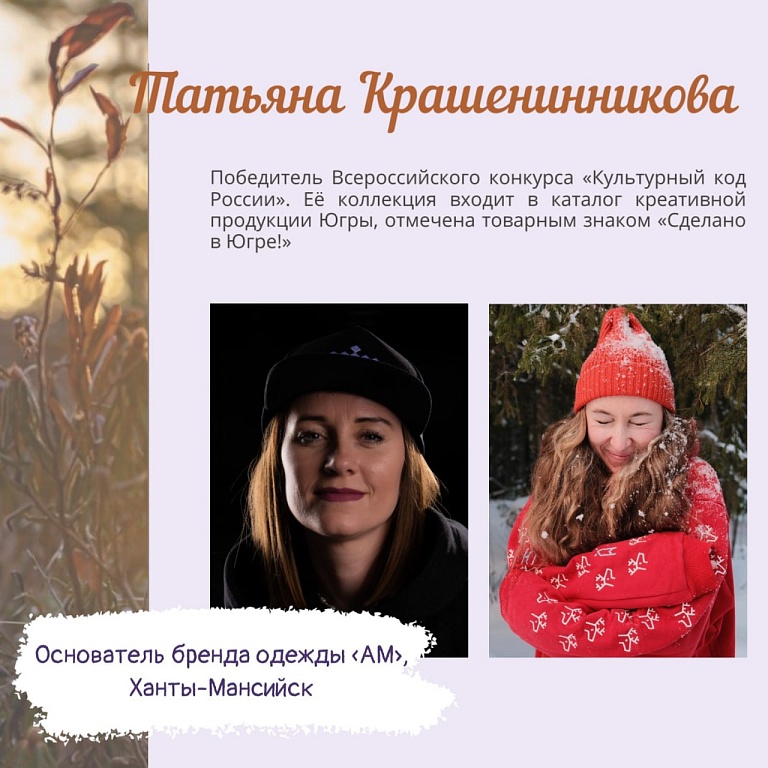 — Татьяна Крашенинникова, основатель бренда одежды «АМ», Ханты-Мансийск. Победитель Всероссийского конкурса «Культурный код России». Её коллекция входит в каталог креативной продукции Югры, отмечена товарным знаком «Сделано в Югре!».