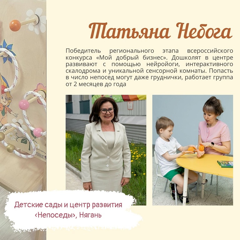 — Татьяна Небога, детские сады и центр развития «Непоседы», Нягань. Победитель регионального этапа всероссийского конкурса «Мой добрый бизнес». Дошколят в центре развивают с помощью нейройоги, интерактивного скалодрома и уникальной сенсорной комнаты. Попасть в число непосед могут даже груднички, работает группа от 2 месяцев до года.