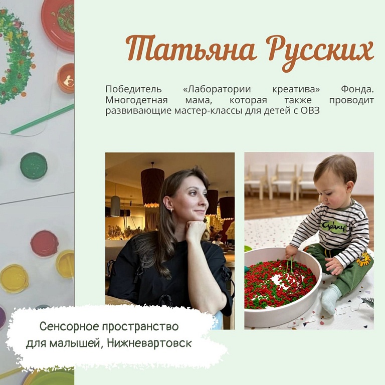 — Татьяна Русских, сенсорное пространство для малышей, Нижневартовск. Победитель «Лаборатории креатива» Фонда. Многодетная мама, которая также проводит бесплатные мастер-классы для детей с ОВЗ.